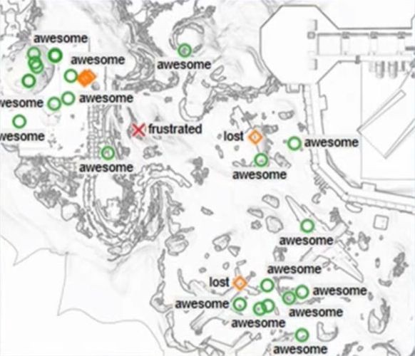 Bungie의 개발팀은 게임 안에 실제로 이 버튼 시스템을 만들어두었다. 버튼이 눌리면, 플레이어의 위치가 지도에 기록된다. 이 데이터로 인해 테스트 팀은 (위에 보이는 것처럼) 간단한 플레이어 감정 지도(heat map)를 만들 수 있었다. 이 지도는 레벨 디자인 팀에게 플레이어가 어떻게 느끼는지 쉽게 보여주고 설명해주었기 때문에 문제 있는 지역을 빠르게 반복 개선할 수 있었다.